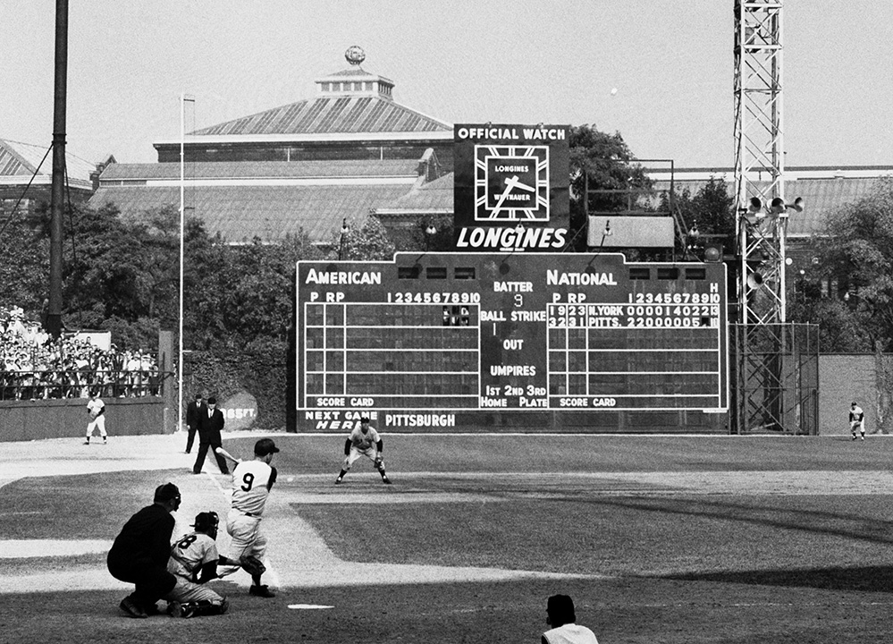“This is my most famous World Series photo. Mazeroski of Pittsburgh hitting the winning home run in the deciding seventh game. You can see the home run ball going over the all informing scoreboard. I worked on this all-telling viewpoint during the game waiting for a defining moment. It came with the home run. The ball over the scoreboard was a once-in-a-lifetime icing on the cake.”