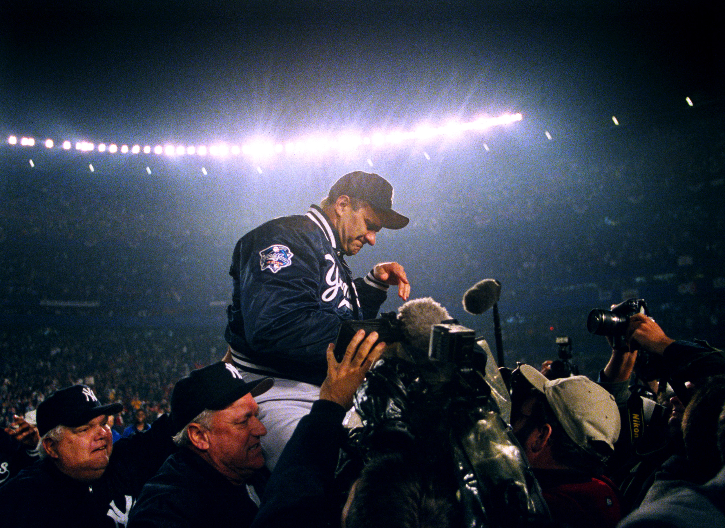 Brad Mangin photographed New York Yankees manager Joe Torre being carried off after winning his third straight World Series for MLB/Getty Images in 2000: