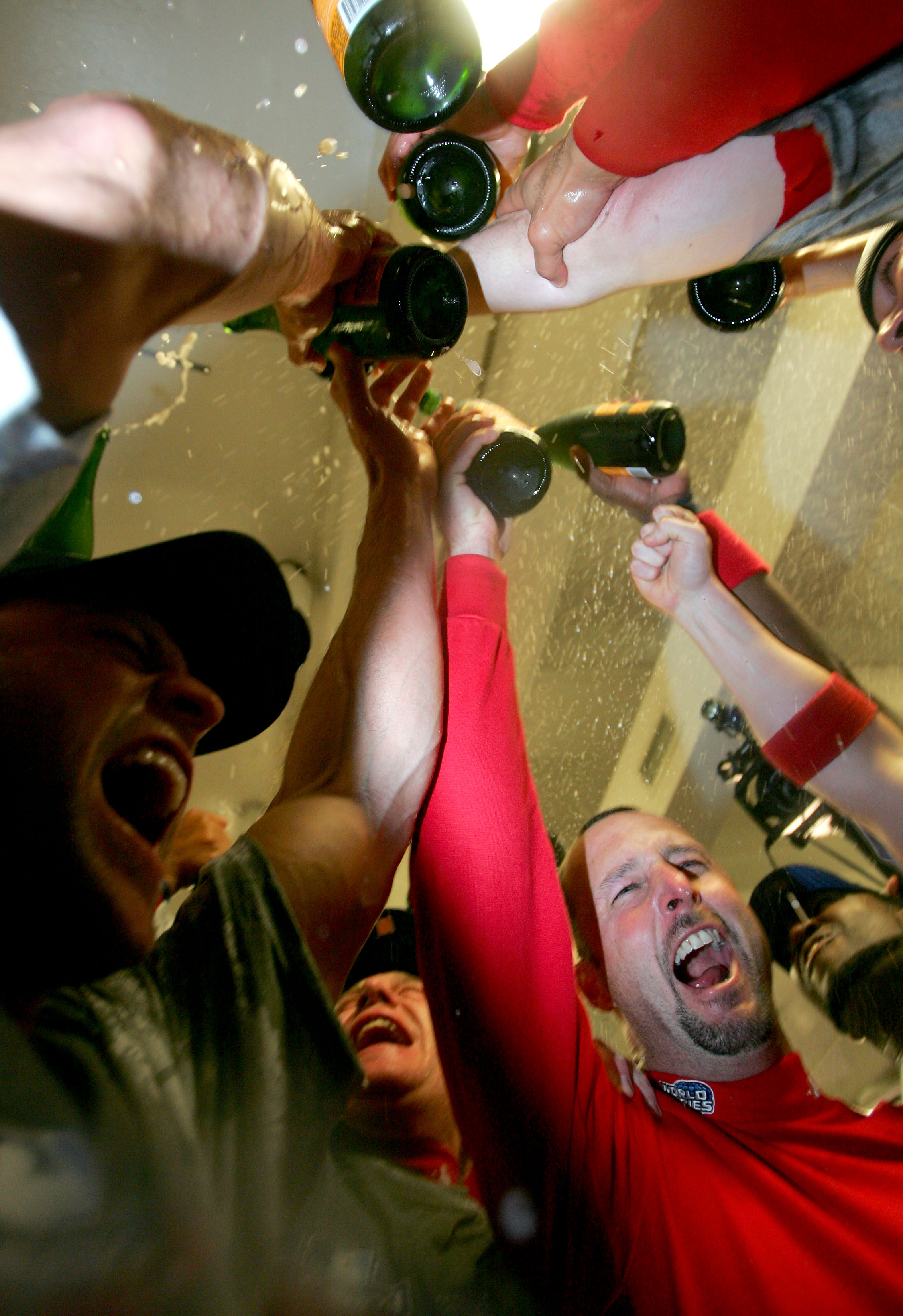 Ezra Shaw captured Red Sox pitcher Tim Wakefield and his teammates celebrating in the locker room after winning for Getty Images on Oct. 27, 2004: