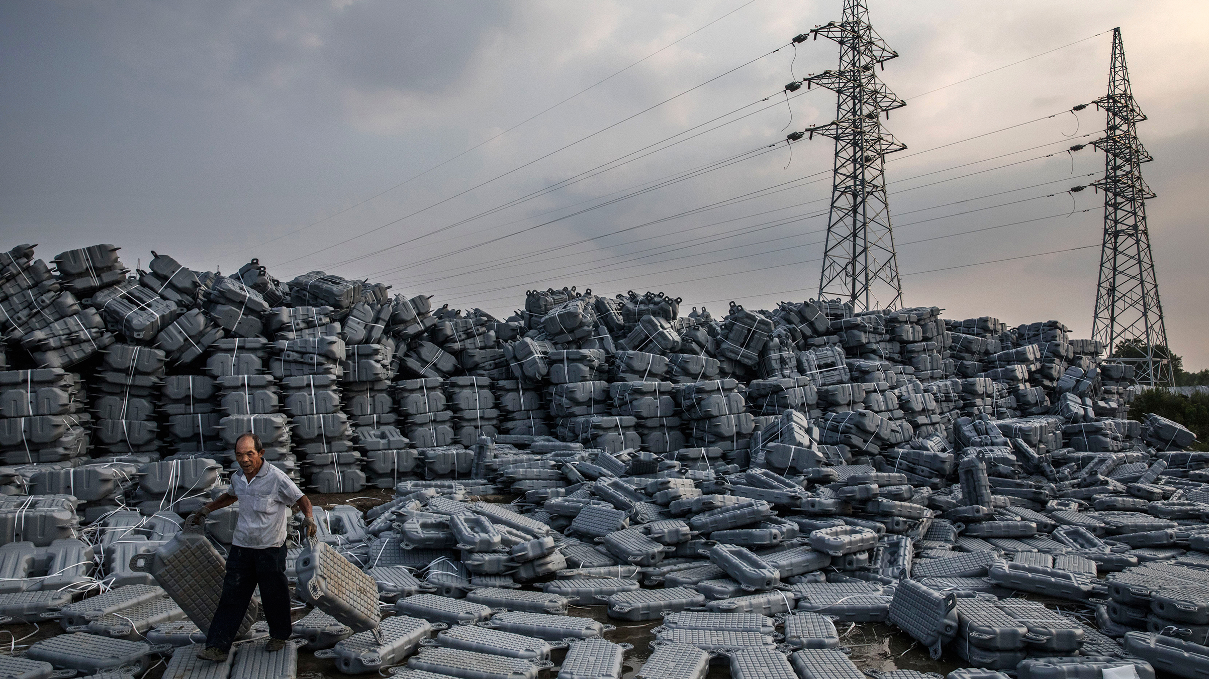 A worker carries flotation devices used to support panels to be used in a large floating solar farm project in Huainan on June 13.