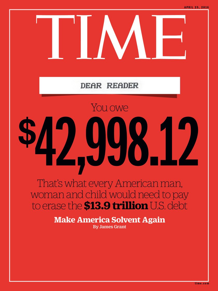 The public debt will fall due someday. (Some of it falls due just about every day.) It will have to be repaid or refinanced. If repaid, where would the money come from? It would come from you, naturally. The debt is ultimately a deferred tax. You can calculate your pro rata obligation on your smartphone. Just visit the Treasury website, which posts the debt to the penny, then the Census Bureau’s website, which reports the up-to-the-minute size of the population. Divide the latter by the former and you have the scary truth: $42,998.12 for every man, woman and child, as I write this.