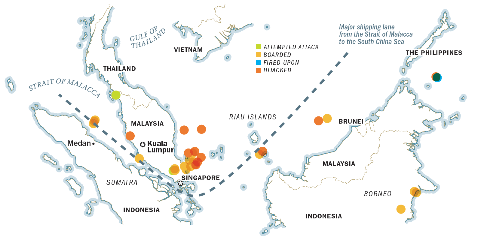 When the world thinks of piracy, it thinks of Somalia and red-eyed young brigands peering over the barrels of their Kalashnikovs. It thinks of the 2013 Hollywood movie Captain Phillips, which tells the story of the hijacking of the Maersk Alabama in 2009 and the capture of its American captain. But the waters of the West Indian Ocean are not the world’s most dangerous. Far from it. The most perilous seas, as the U.N. declared last month, are those of Southeast Asia — and for criminals they offer sumptuously rich pickings.