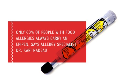 According to Dr. Kari Nadeau, associate professor at Lucile Packard Children’s Hospital, Stanford and Stanford University School of Medicine, who is treating Zach, only 55% to 60% of people with food allergies always carry an EpiPen. Benadryl helps with rashes, but can’t prevent anaphylaxis. If a person is wheezing, turning blue or throwing up with hives, use the EpiPen—it can’t hurt. She advises families to have two Epis at all times, because the reactions are so unpredictable. “You can have one type of reaction one day, but then there is a 25% chance of having a completely different reaction to the same amount of food on a different day,” says Nadeau. “If you have a virus or if you’ve taken a hot shower or if you’ve just exercised or been out in the hot sun, that changes your threshold and you could have a full-blown reaction.” In other words, daily life matters. Even a low immunoglobulin E (IgE) test, a blood test to check whether someone is allergic to a substance, doesn’t necessarily mean that person will have a mild response.