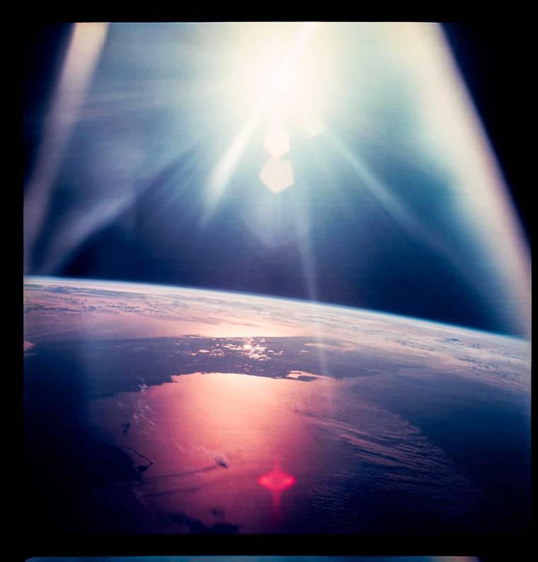 From the high ground of space, it’s almost impossible to take a bad picture of the jewel box landscape below, but the Apollo VII crew managed that ignoble feat. The odd framing and poor sun control in this shot destined it for the discard pile. But that’s Florida below, with the north end of the state to the left and the south to the right and the embarkation point—Cape Canaveral—visible as a sharp projection along Atlantic coast. The red light on the Gulf of Mexico and the comparatively low angle of the sun create the mood of a tropical sundown—a little bit of beachfront bliss that was, at that moment, entirely out of the astronauts’ reach.