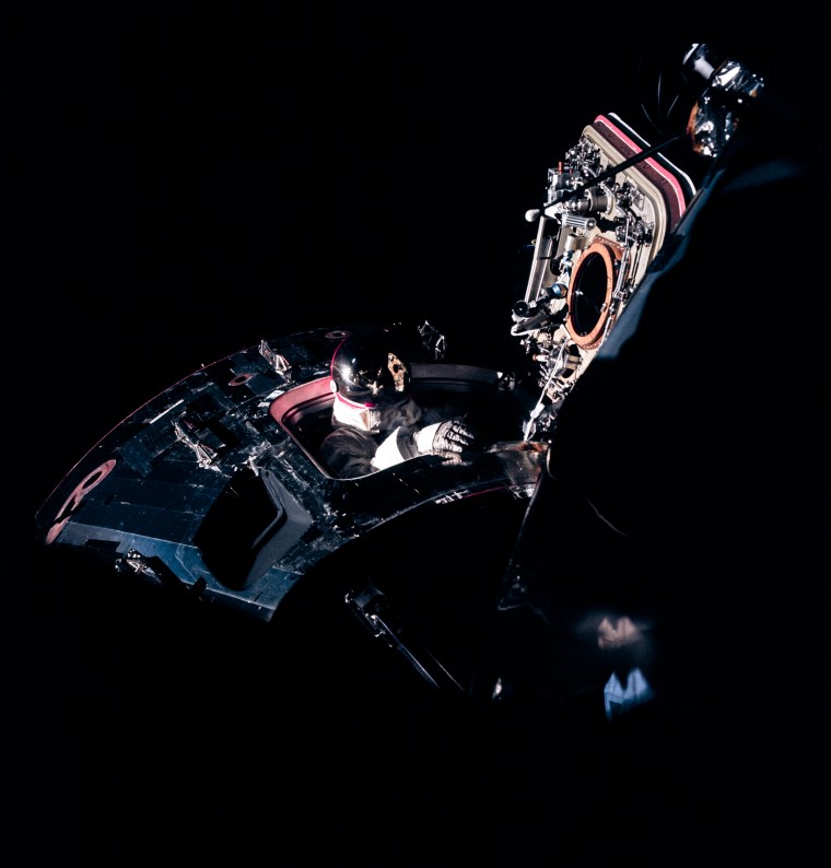 The Apollo IX mission test-flew the command module and lunar module together in Earth orbit. Dave Scott’s spacewalk was one of the most-photographed parts of the mission and one of the images—brilliantly lit, artfully composed, showing both spacecraft in a single frame—became a NASA icon. But the truth was closer to the outtake here, with Scott emerging as the spacecraft flow over the nighttime side of the Earth, a solitary man almost lost in shadow, venturing from the safety of the Apollo burrow into the killing cold of space.