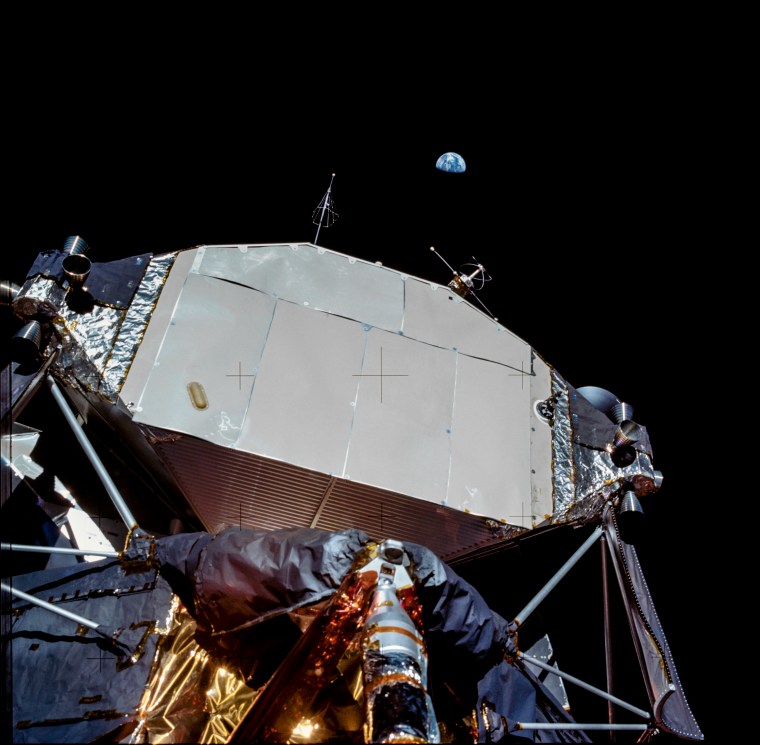 If there was one sight that could make an Apollo astronaut nervous, it was this. The Earth in this image from Apollo XI looks dauntingly far away and the lunar module—which appears to have been stapled together from sheet metal—seems barely up to the task of making the trip off the surface. In fact it was more than capable, and its lightweight design was one of the thing that made it so flight-worthy. Only the top half of the lander—the silver section, here photographed from behind—would lift off from the moon. The bottom portion—the mostly gold colored struts and legs—would serve as a launch platform and remain behind.