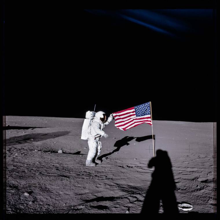 The business of planting the American flag on the lunar surface never got old. The larger view was always the better one, of course: American astronauts were emissaries not of a nation, but of a species. But the 205 million members of that species who lived in the United States still thrilled to the image of the stars and stripes. On Apollo XII, it was Al Bean’s job to plant and position the flag—which was stiffened in the airlessness of the moon by a rod stitched into its top edge. Commander Pete Conrad, like generations of vacation photographers, is visible only as a long shadow.