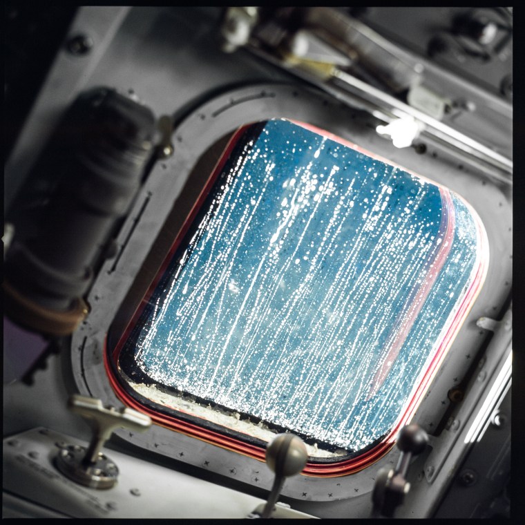 Spaceflights were often reconnaissance missions and dirty portholes could make that job impossible. Gas trapped between layers of glass or moisture picked up on the way out of the atmosphere could make windows impossible to use, though the fogging or streaking would often clear up as the sun warmed the spacecraft skin. The public saw only the pretty pictures shot through clear windows, but here the Apollo 12 crew took a shot to show NASA the challenges they faced.