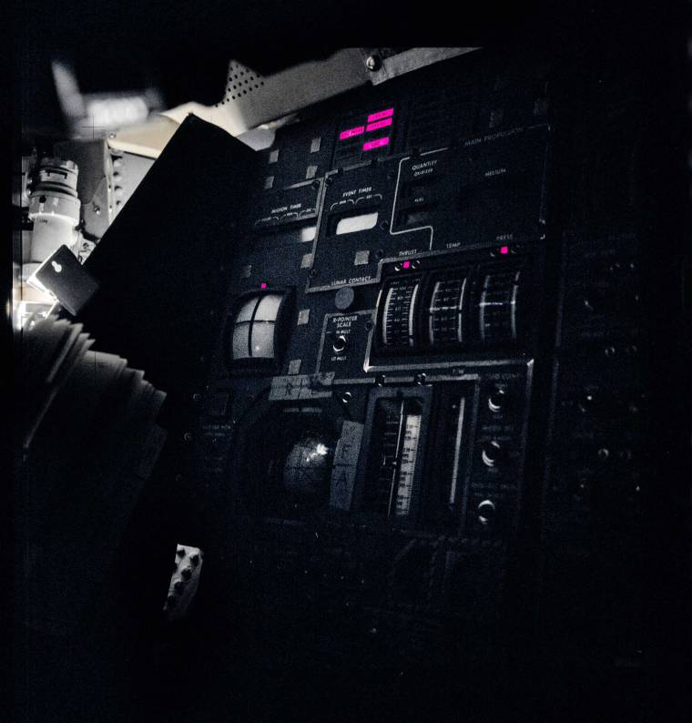 The cockpit of the LEM was supposed to be a bright and active place, but on Apollo XIII it became a darkened still lifeboat, as the crew shut down nearly all of its power and took refuge in the hope of getting home after an explosion disabled their command module. In the middle of the instrument panel a label that reads “lunar contact” is barely visible. A blue light beneath it was supposed to flash on the moment the lunar module made contact with the lunar surface. On Apollo XIII, it remained forever dark.