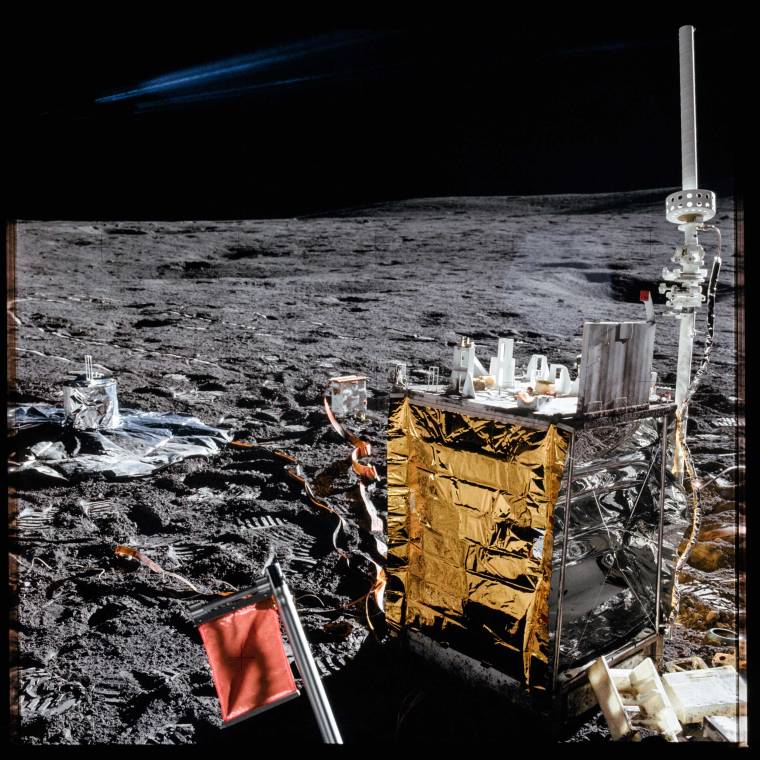 It was often hard to tell the difference between the litter and the scientific experiments the Apollo astronauts left on the surface, as this image from Apollo XIV shows. In this case, the shot is of science; the gold, boxy object is the central station of what was known as the Apollo Lunar Surface Experiments Package (ALSEP). The tarp-like circle of silver with the can-shaped object to the left is the seismograph, one of six instruments that made up the ALSEP. The last of the experiment packages left on the surface winked out on Sept. 30, 1977, close to five years after the final lunar landing.