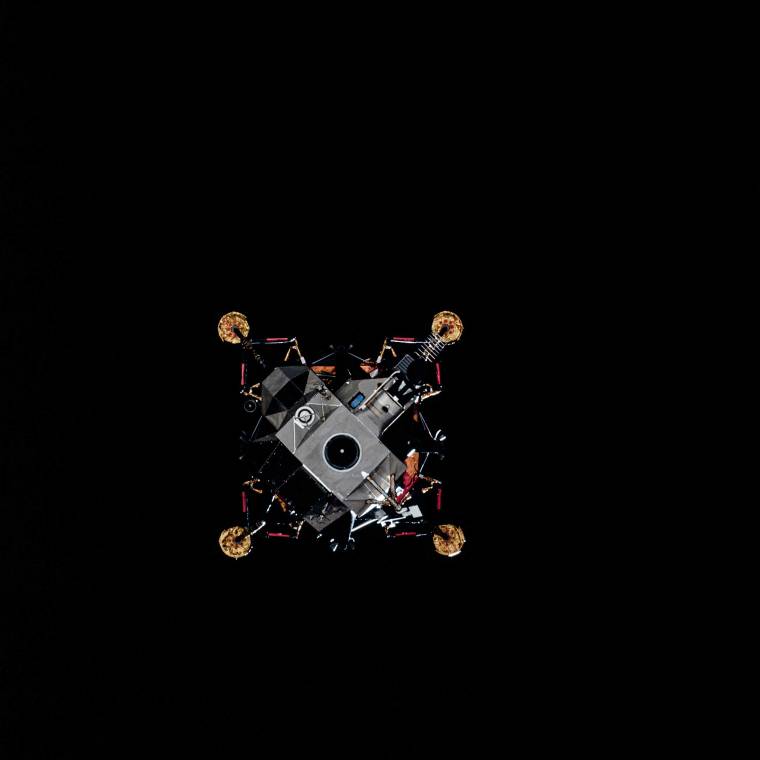 From some angles, the irregularly shaped LEM could achieve a certain doily-like symmetry. Apollo XIV’s Stu Roosa captured this image of the top of the lander as it drifted away from the command module. The dark circle at the center of the roof is the docking port, where the nose of the command module would connect, allowing a tunnel to be opened between the two ships. On the LEM leg at the 2 o’clock position, the ladder that astronauts Al Shepard and Ed Mitchell would later climb down to the lunar surface is visible.
