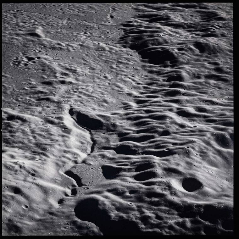 The ancient, desiccated moon that we see from a distance belies a certain fluidity that’s visible up close, as captured by the Apollo 15 crew. Like the volcano fields on the Hawaiian island Hilo, some regions of the moon have preserved the state of the landscape just as it was when the lava that flowed across it hardened. Snaking channels like the one that twists about a third of the way up the image from the bottom of the frame might have been lava riverbeds. Apollo missions never flew during a full moon, since the far side would have been blacked and on the near side, the overhead sun would have eliminated shadows, which, as in this image, can help highlight topography.