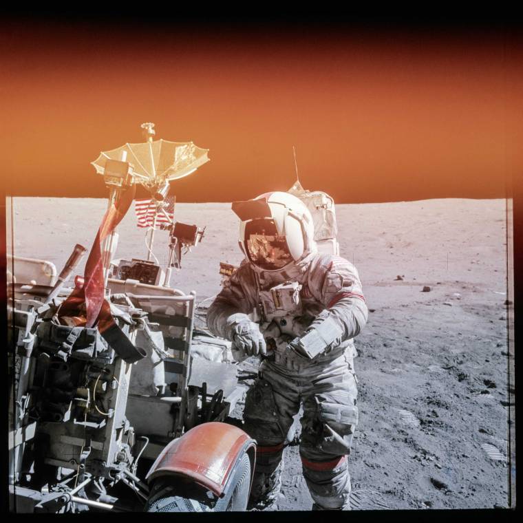 On the last three landing missions, the country that led the world in the manufacture of cars also sent them to the moon. The lunar rovers never traveled faster than about 11 mph (18 km/h) though in the moon’s 1/6th gravity, that provided what felt like a light, speedy ride. Here, Apollo XVI’s John Young leans seemingly jauntily against his ride, with the overexposed top half of the image creating the overall effect of a casual vacation shot snapped during an off-road trip in the desert southwest—minus the can of beer that really ought to be perched on the fender.