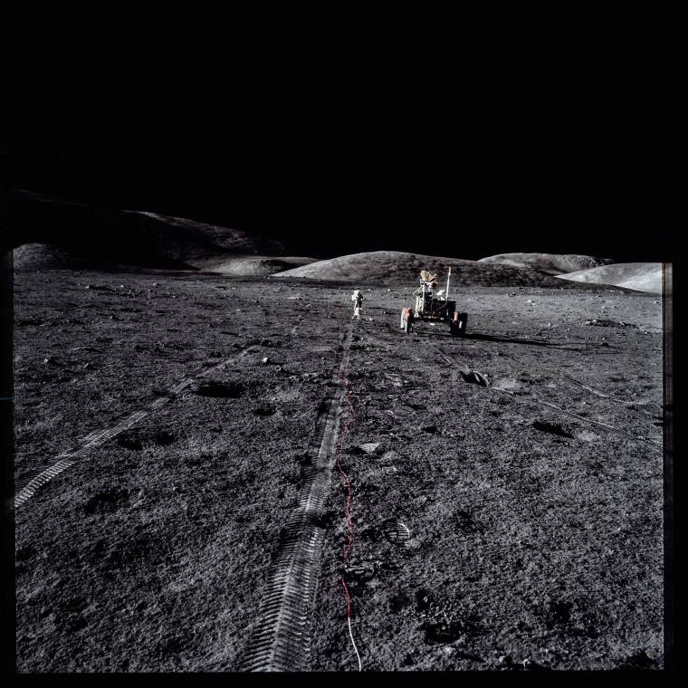 There aren’t a lot of straight lines on the tumbledown surface of the moon—or at least there weren’t until humans arrived. Apollo 17—like Apollos XV and XVI—left tire tracks nearly everywhere they traveled. In the windless, rainless, erosion-free environment, the tracks endure, close to half-a-century on. This image, captured in a haunting black and white that was not at all in keeping with the kinds of images NASA liked to release, captures what a lonely business making those permanent marks could be.