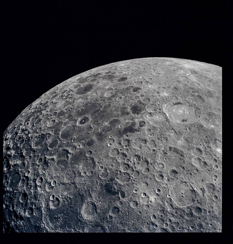 During all of the lunar flights except the last, crews surveyed the ground below to study future landing sites. Heavily cratered regions like these, photographed by the Apollo XVII crew, dominate the far side of the moon and frame the so-called seas on the near side. They were no-go zones for landings since the ground was so uneven. It was the seas—which are actually great plains that resulted from ancient lava bleeds—that were the first targets.